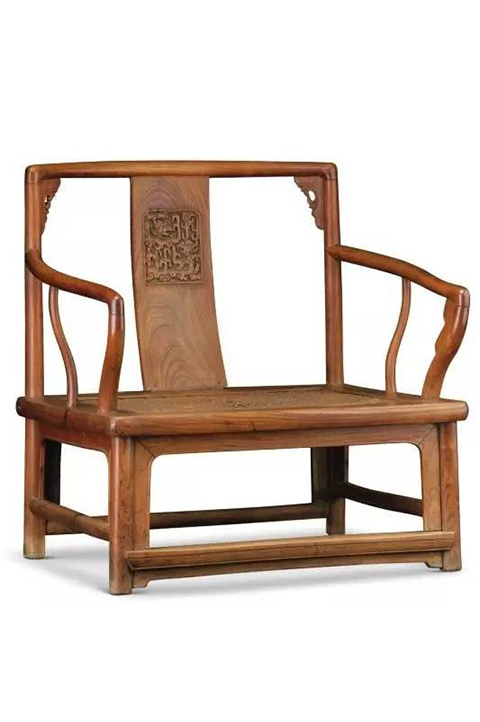 凡搭脑和扶手都不出头的椅子,在北京地区通称为“南官帽椅”。因此这件榉木扶手椅可称为“矮南官帽椅”。形制独特,较为罕见。搭脑向后弯曲,两端逐渐收分,烟袋榫与后立柱相接,加装透雕草花牙角。扶手与前立柱烟袋榫相接处也装牙角。座面以下装起阳线的券口牙板,落在“踏脚牚”上,牚下又装小牙板。两扶手向外弯曲,留出更大的坐具空间。扶手下的“镰刀把”与“鹅脖”均做成两弯,继续增大空间。座面极为低矮。椅面为原装胡椒眼编织藤席软屉,藤席下面为十字交叉棕屉。据王世襄先生考订“很可能是寺院禅椅,专供趺坐而制的”。此椅总体上宽肥硕大,舒适自如。靠背板上窄下宽,以方形铲地浮雕为装饰,题材为“夔凤喜相逢”。因有透雕草花角牙点缀,空白极大的靠背却不显空洞。