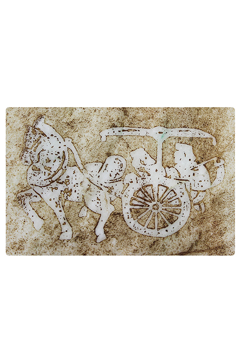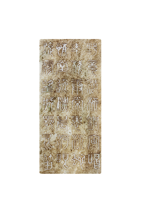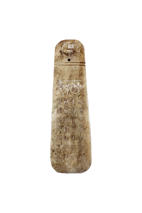 玉圭,古玉器名。古代帝王、诸侯朝聘、祭祀、丧葬时所用的玉制礼器。为瑞信之物。形制大小,因爵位及用途不同而异。此玉圭重527g,长29.2cm。正面有文曰:“武陵王上圭”,圭上方有“皇帝”二字,下面有“大秦始皇帝制”五字。背面上方有一圆圈,内有“福寿”二字;中间有一车马图案,跃然圭面,栩栩如生;下方有四行共二十八字铭文:“野竟清柳铜宙唱,率栈泰常患流蛇,情堂逸標晨河睍,旋彪望城郸昆笛”。正背两面字体皆为篆书。虽日久经年,然此玉圭品相保存依旧完好,因而具有极高的收藏价值。