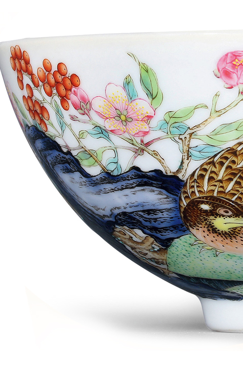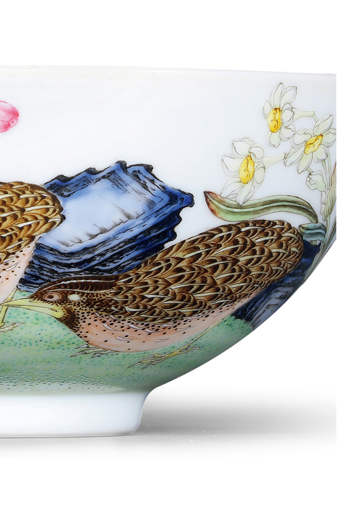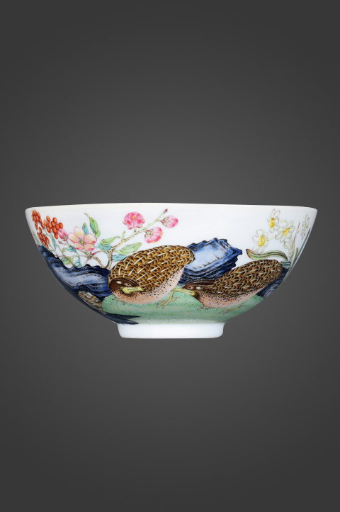 小碗通景式构图,绘画鹌鹑、梅花、南天竺、水仙、洞石,合成平和安定、天仙拱寿之意。话说,雍正爷十分心水这种寓意吉祥的题材,毕竟是经历过“步步惊心”的人。此碗画面色彩绚丽,填色工整华贵。
